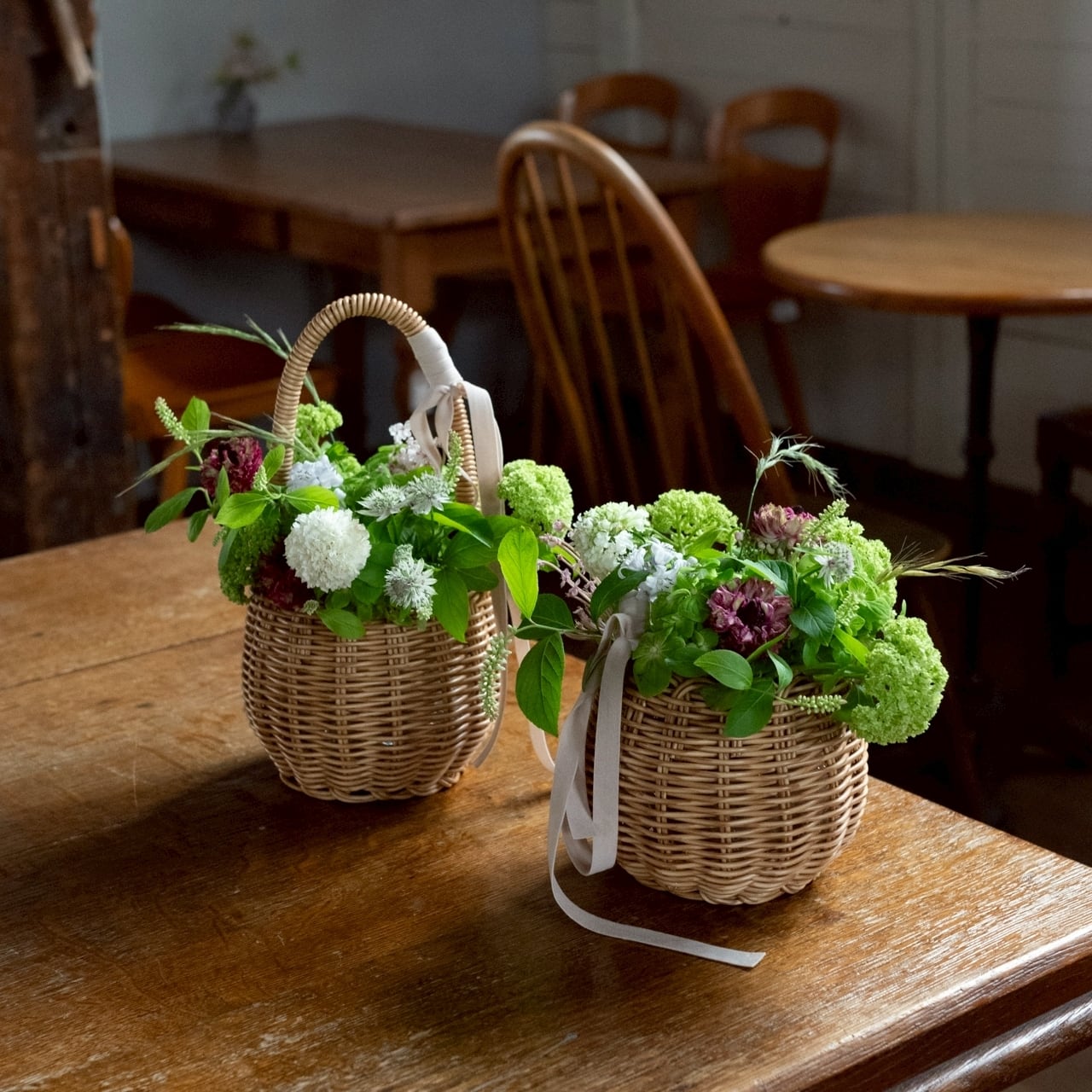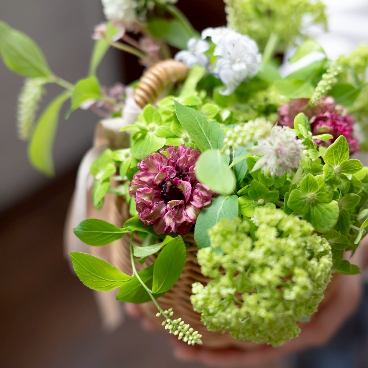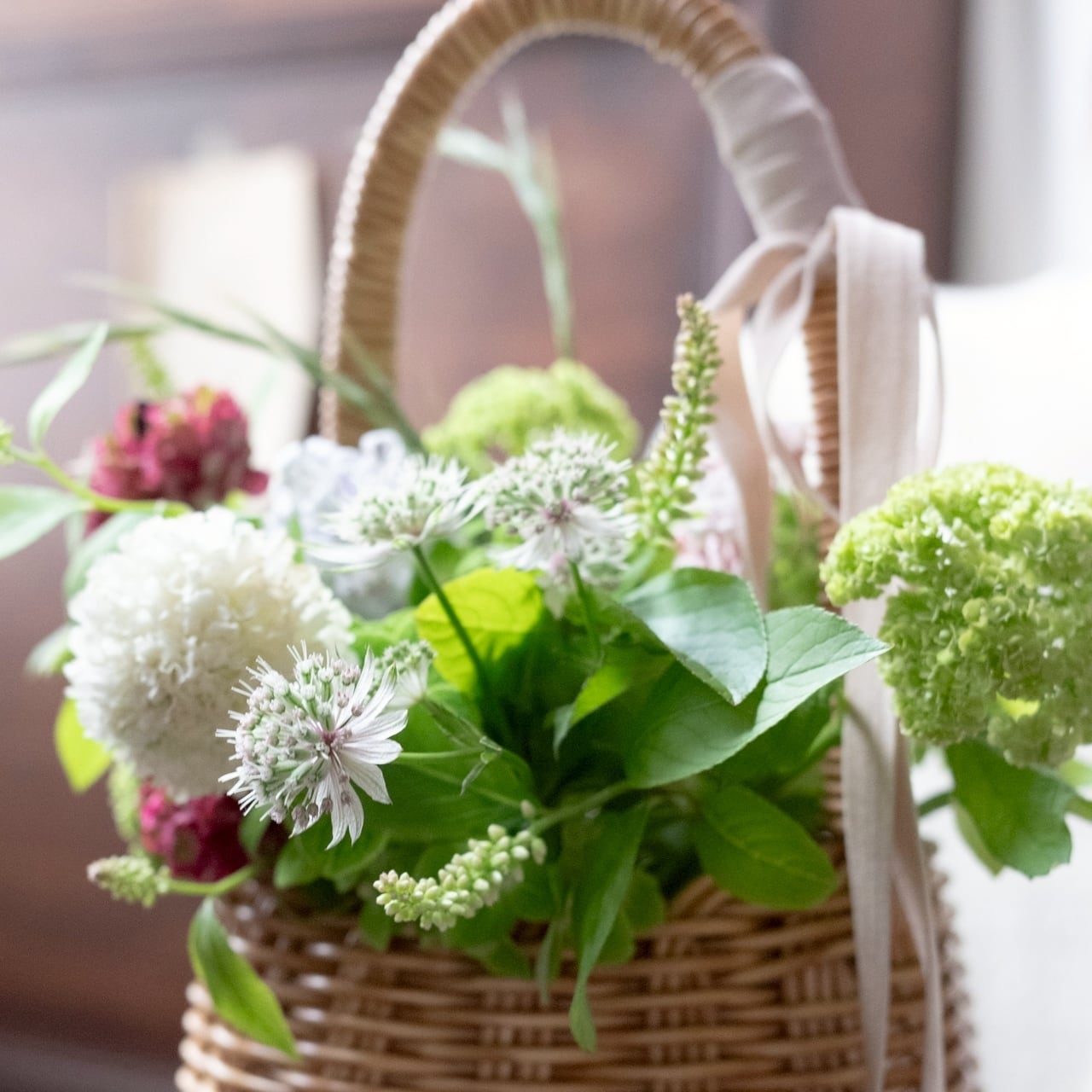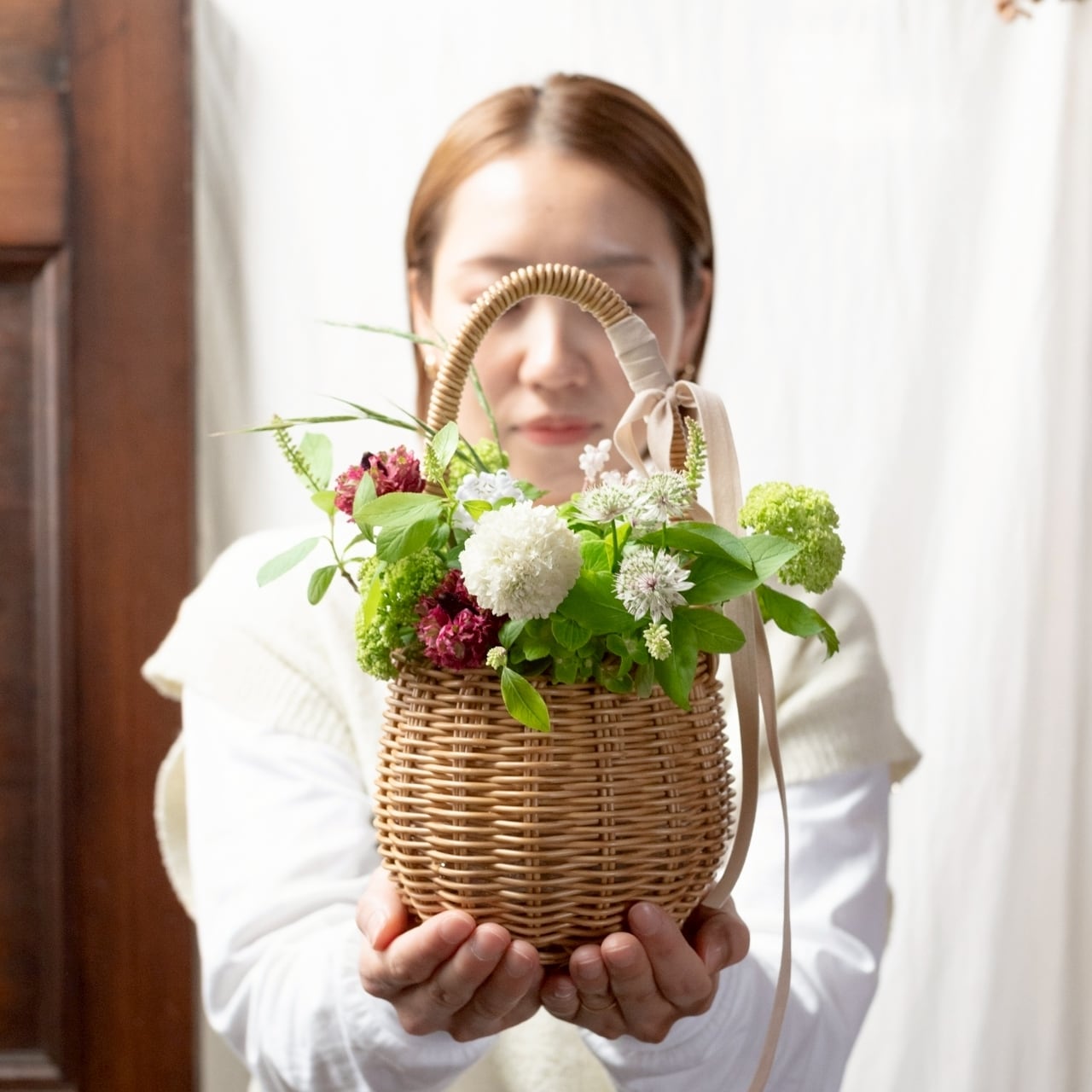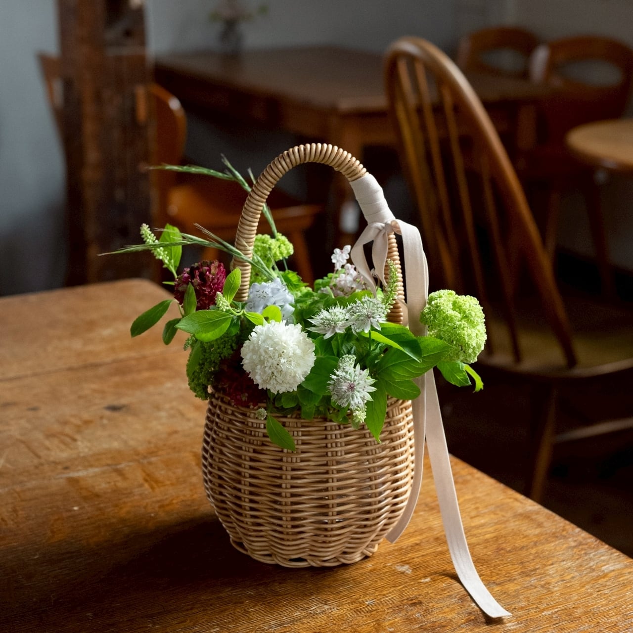 グリーンをベースに、季節のお花を合わせてバスケットにアレンジしてお作りいたします。