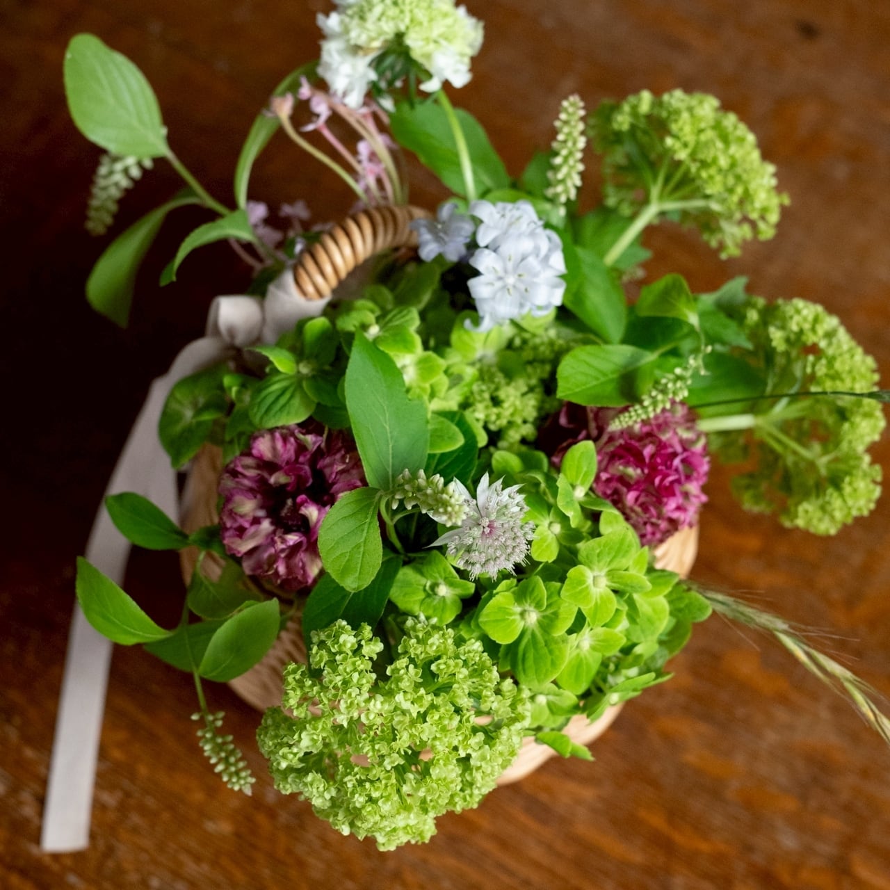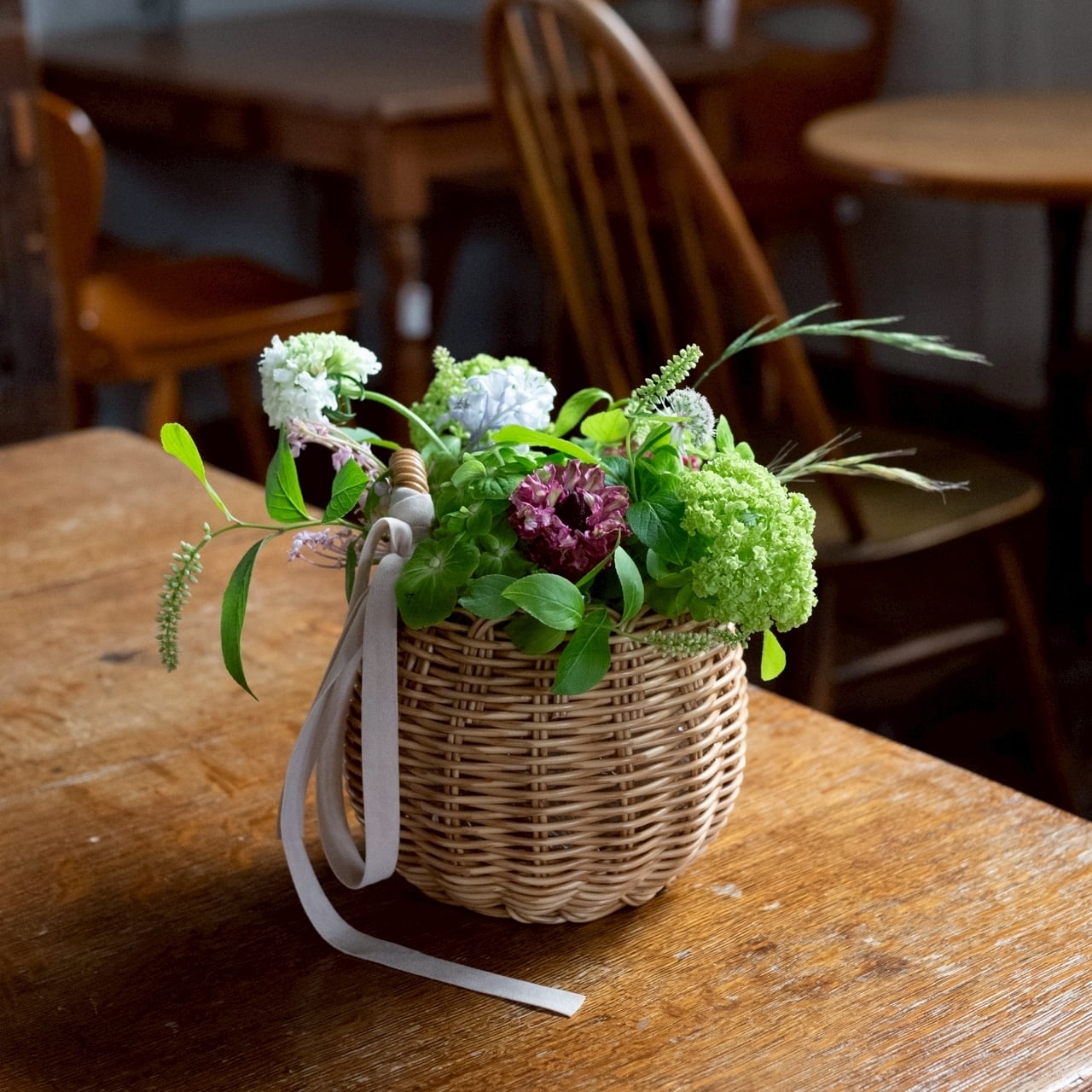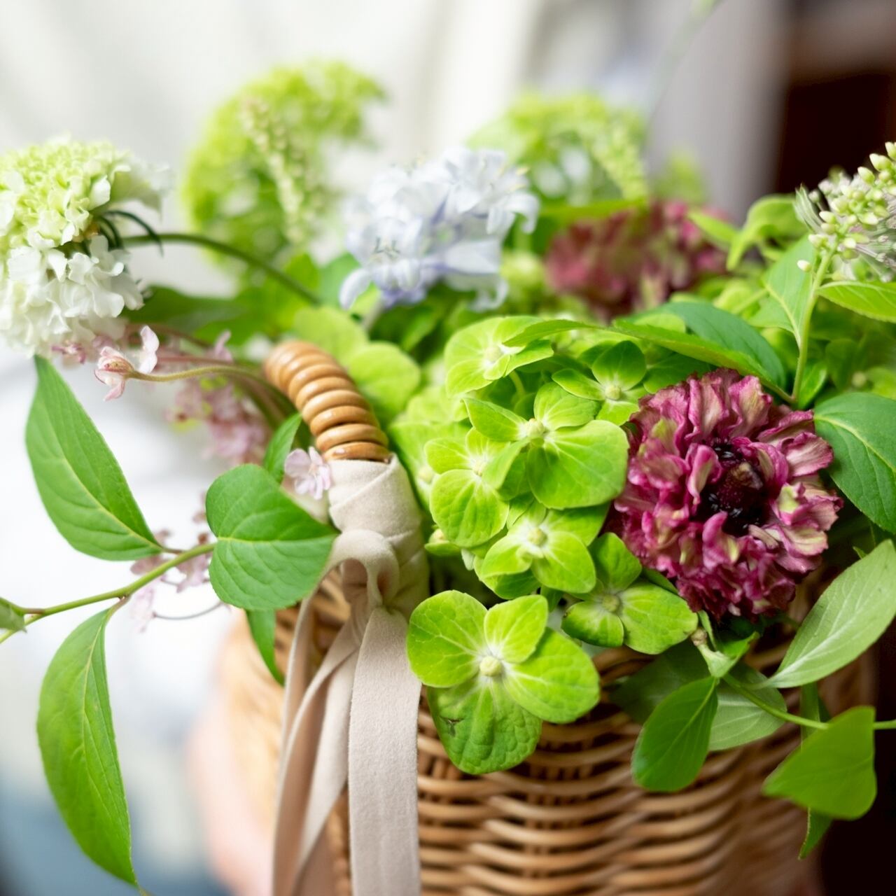 グリーンをベースに、季節のお花を合わせてバスケットにアレンジしてお作りいたします。