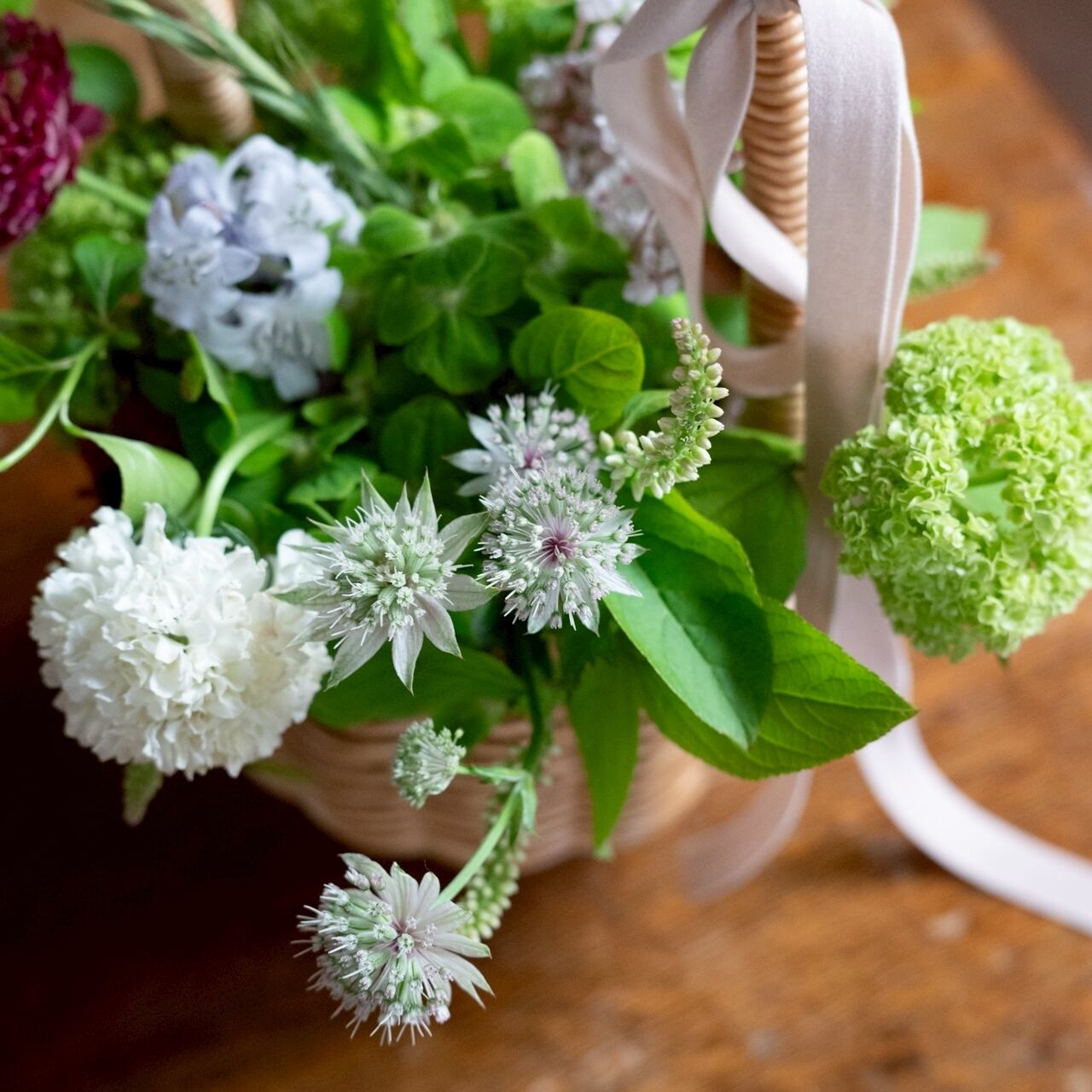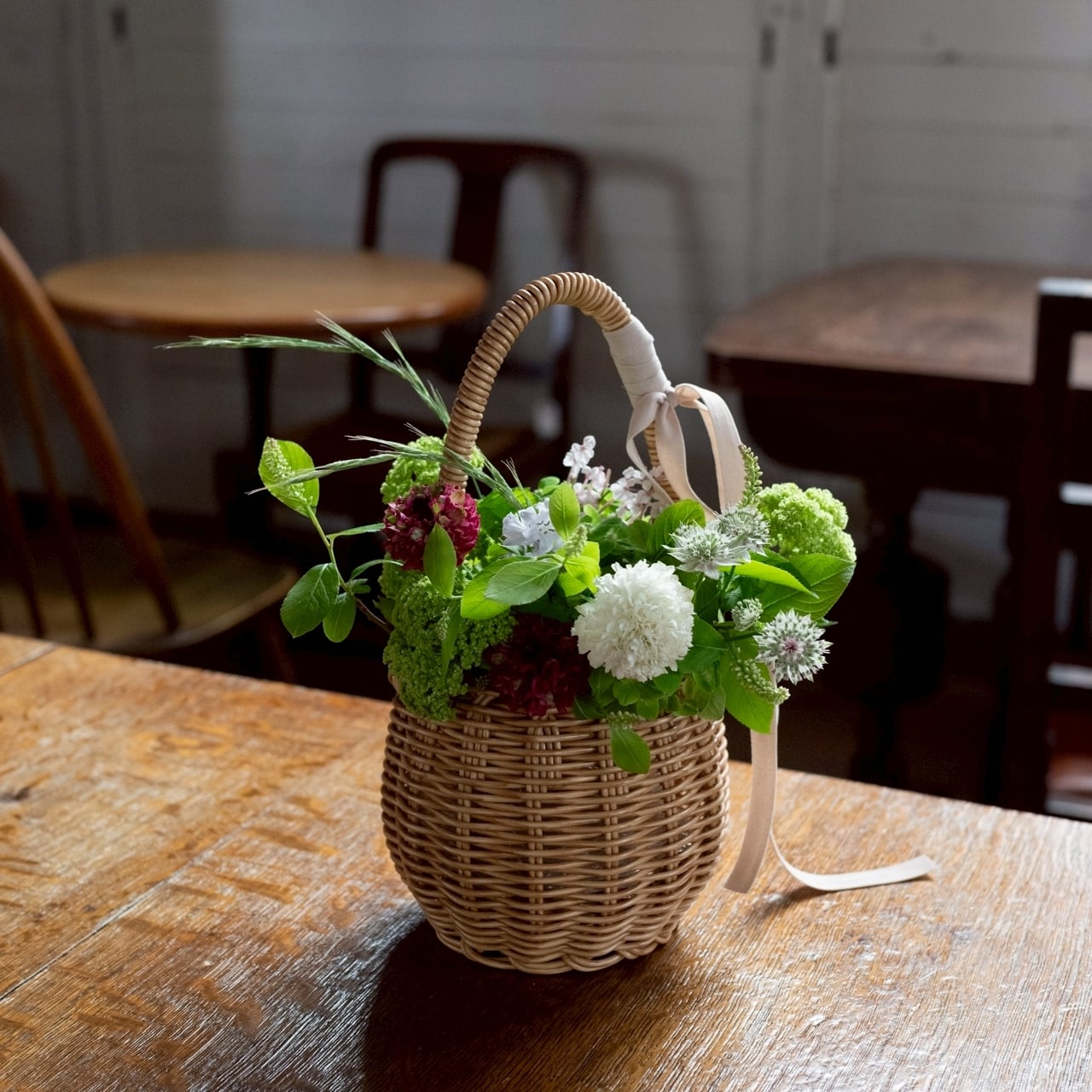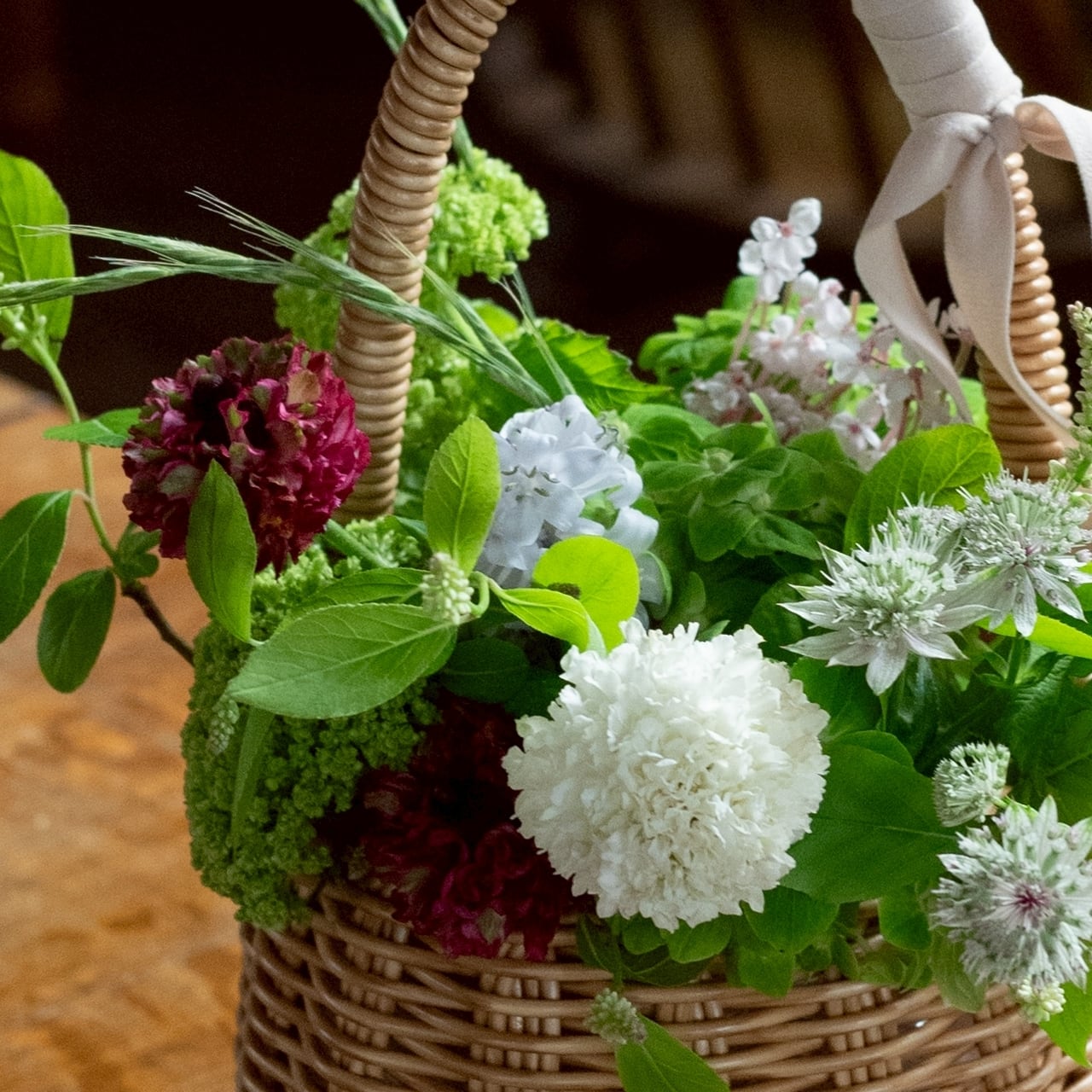 グリーンをベースに、季節のお花を合わせてバスケットにアレンジしてお作りいたします。